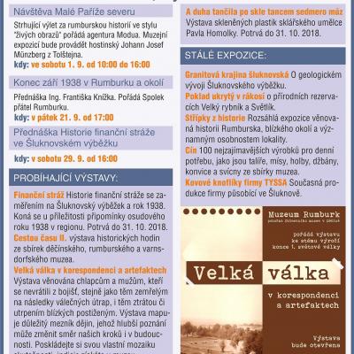 Program září a říjen 2018 místoMuzeum Rumburk Program na měsíce září a říjen 2018 29. 08. 2018 - 10:00 Srdečně zveme do Muzea Rumburk. Prosíme však, sledujte i naše webové stránky a facebookový profil, kde se může objevit i nějaká aktuální akce. Děkujeme předem za Vaši návštěvu, jsme přesvědčeni, že se Vám budou nové expozice líbit.